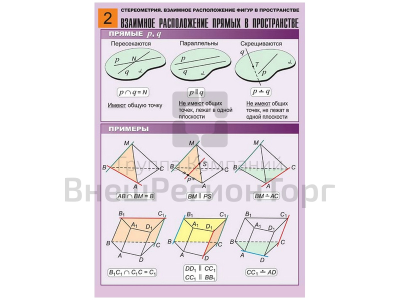Комплект таблиц по геометрии Стереометрия. Взаимное расположение фигур в пространстве, 8 таблиц, А1