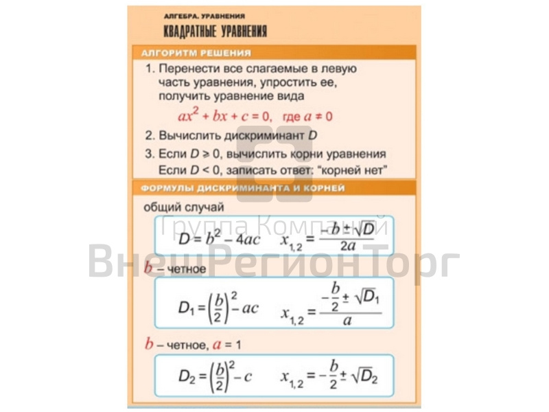 Таблица демонстрационная Квадратные уравнения, 100х140