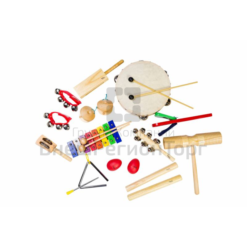 Перкуссионный набор состоит из 12-ти предметов, оформленных в красочном стиле: разноцветного металлофона с палочкой, пары кастаньет, кастаньет на ручке, тон-блока, гуиро, пары шейкеров, пары клавесов, тамбурина, пары браслетов с колокольчиками на руку, треугольника, двух джингл-стиков.