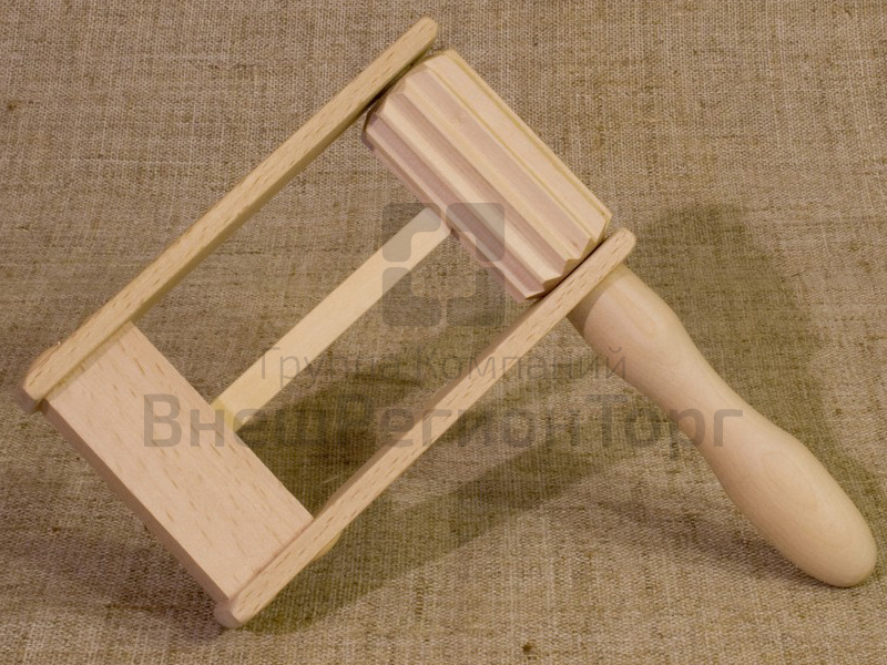 Представляет собой зубчатый барабан, совмещенный с ручкой. На зубчатом барабане вверху и внизу крепятся пластины, соединенные прямоугольной бобышкой. В бобышку вклеена деревянная пластина, которая упирается в барабан. При вращении барабана пластина перескакивает по зубцам и издает громкие щелчки. Вращение может осуществляться в любую сторону.