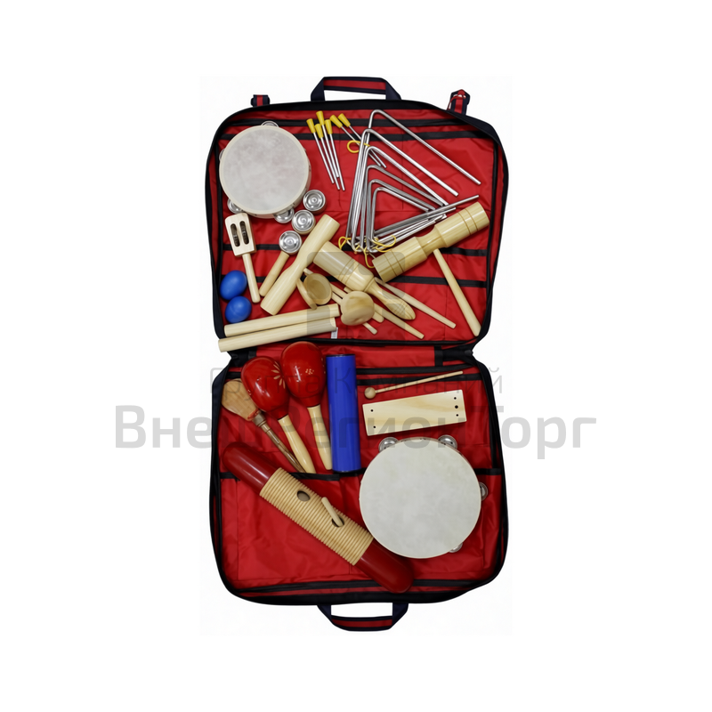 В комплекте: маракасы- 1 пара, джингл-стик - 1 шт. кастаньеты - 1 пара, кастаньеты на ручке -1шт., тон-блоки-4шт., гуиро-1шт., шейкер- 2шт., клавесы-2шт., треугольники - 6шт., тамбурин - 2шт.