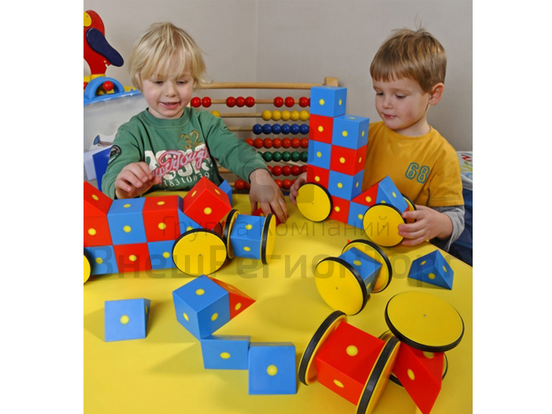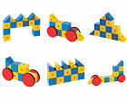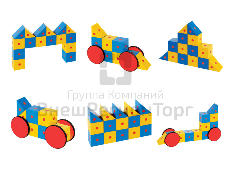 В КОМПЛЕКТЕ: 20 пластиковых магнитных блоков 2-х разных цветов (10 кубиков, 6 объемных прямоугольных треугольников), 4 набора колес.