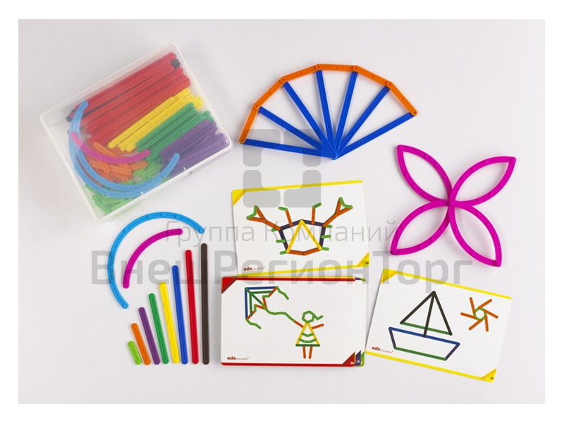 В наборе: 200 гибких пластиковых палочек и 30 двусторонних карточек с заданиями.