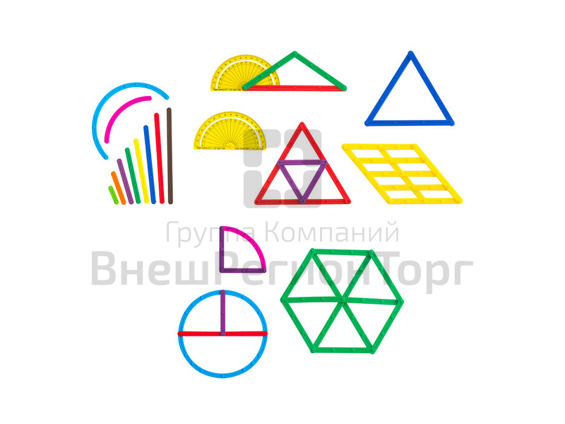 палочек позволяют сделать сектор, окружность и т.д. А 2 прозрачных пластиковых транспортира позволят детям изучать планарную геометрию.