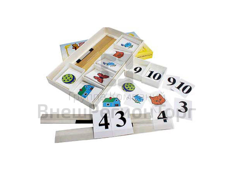 Учебное пособие представляет собой набор карточек с цифрами от 1 до 10 и пяти видов фигурок разного цвета. В состав пособия входят также и три пластмассовых кармана с магнитами для установки в них карточек. Карточки и карманы уложены в коробку.