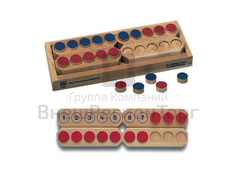 Двадцать двухцветных деревянных фишек (синий и красный цвет) в четырех деревянных "корабликах". На одной стороне кораблика находятся гнезда для пяти двуцветных фишек, на другой стороне изображены цифры.