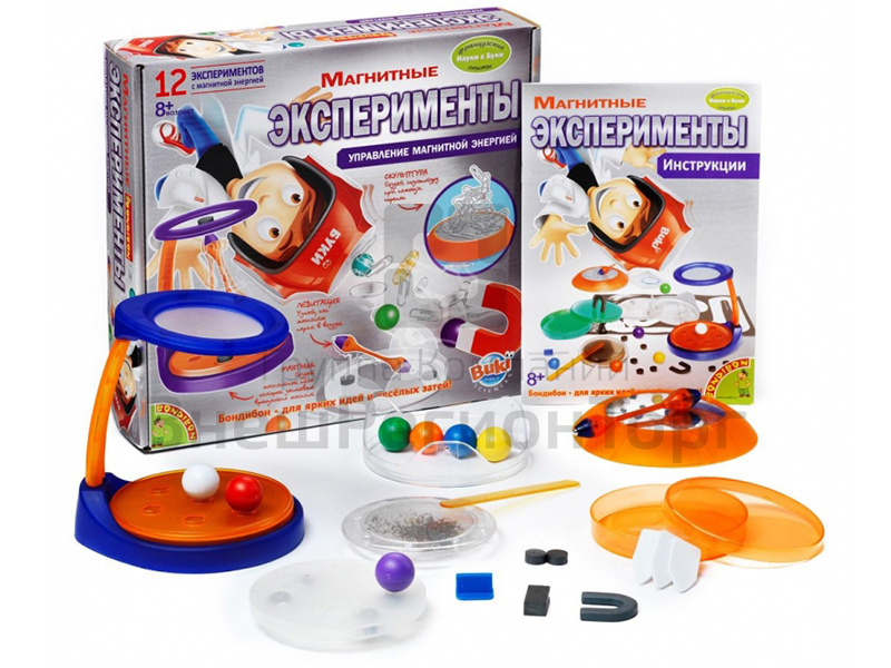 В комплект входит все необходимое для проведения 12 экспериментов, а также подробная инструкция на русском языке. Все они помогут изучить свойства магнитов.