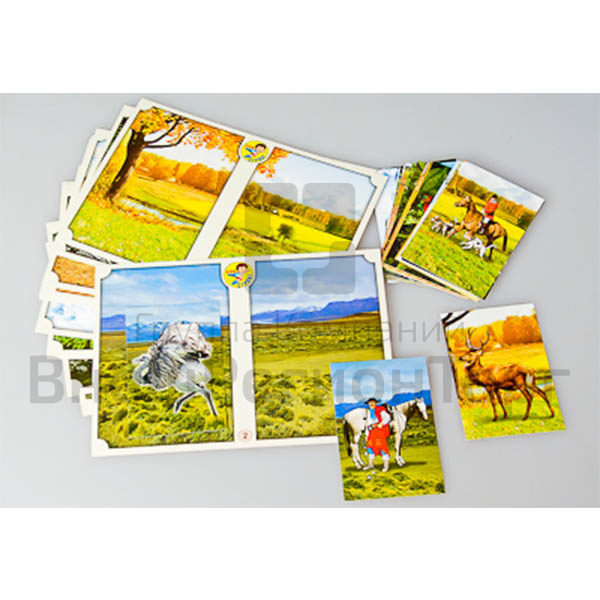 Игра состоит из 16-ти полноцветных игровых полей формата А5 и 32-х полноцветных карточек. Карточки и игровые поля изготовлены из картона и ламинированы пленкой.