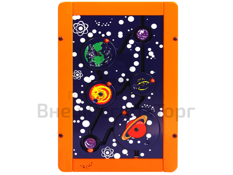 Очень интересный игровой модуль с космической тематикой. Пестрый рисунок звезд и планет на темном фоне делает его привлекательным для детей. Необходимо вращать диски, перемещать шарики по желобкам, путешествуя с одной планеты на другую. Как и для чего использовать крутящиеся диски – детям предстоит догадаться самим. На обратной стороне модуля – головоломка, поэтому его можно использовать как двусторонний.