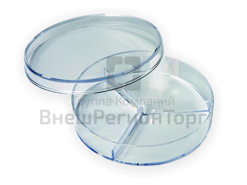 Чашка Петри стерильная, круглой формы поделена на 3 секции для посева культуры на различные среды. Использование трехсекционных чашек позволяет снизить расходы питательной среды и сделать посев одной культуры на различные среды в одной чашке.