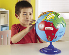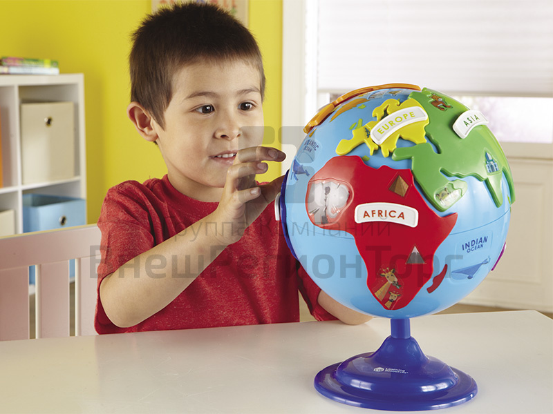 Глобус-пазл, который показывает материки и животных, обитающих на них. Каждый кусок головоломки (материк) укладывается в свой пазл на земном шаре.