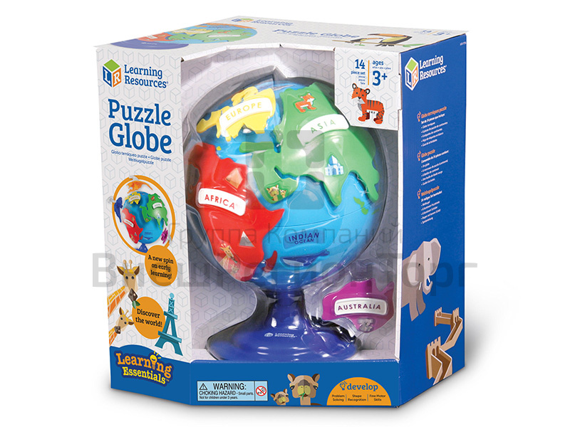 Глобус-пазл, который показывает материки и животных, обитающих на них. Каждый кусок головоломки (материк) укладывается в свой пазл на земном шаре.