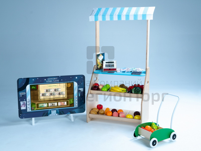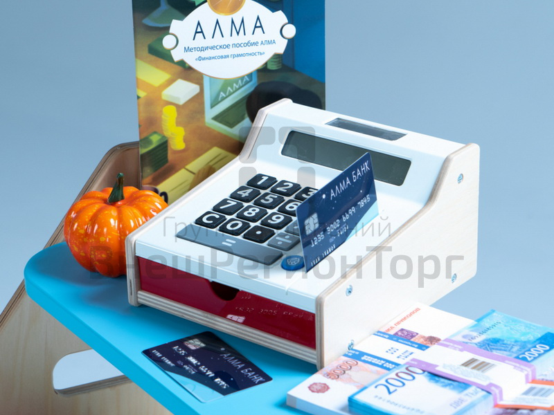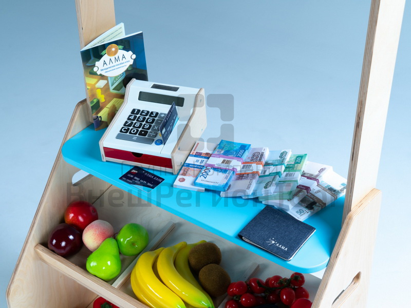- Детский киоск АЛМА "Магазин" с кассой, тележкой и продуктами. Макеты денег и пластиковых карт, копилки, кошельки, наборы для игры в группе на тему уроков.