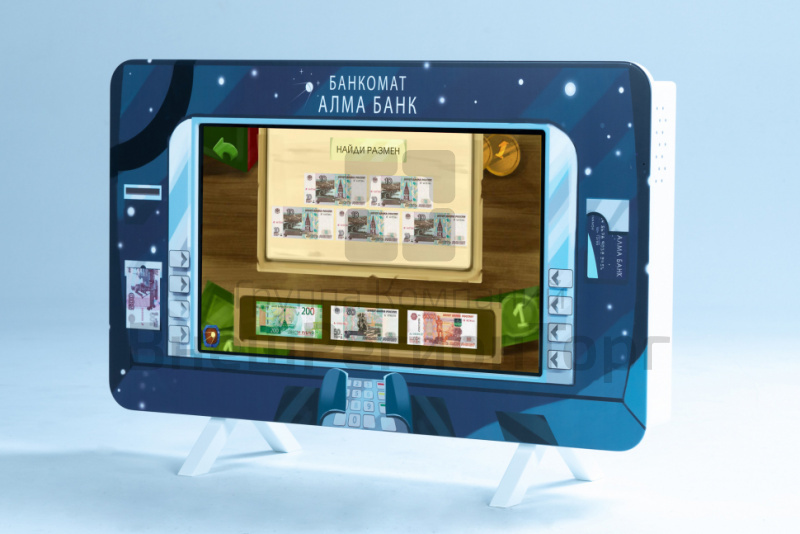 - Терминал АЛМА "Банк". Интерактивный терминал банкомата с диагональю экрана 25 дюймов, поддержкой одновременной работы до 4 детей, прочным корпусом и экраном, тематическим оформлением в виде банкомата.