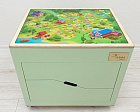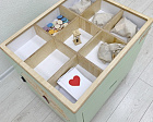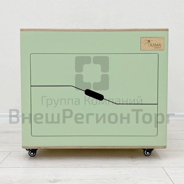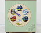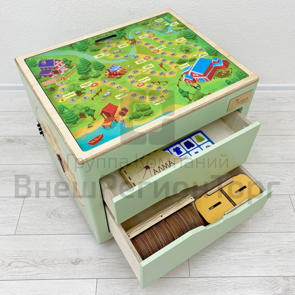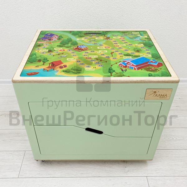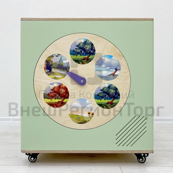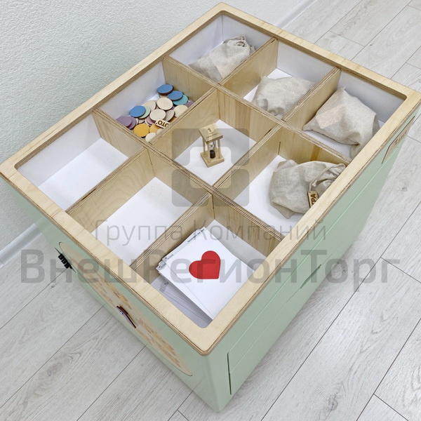 Мобильный куб на колёсиках может передвигаться в любое место класса, где детям удобнее заниматься, по бокам он оформлен бизибордами «Колесо настроения» и «Времена года», а сверху на крышке – красочная пошаговая игра-бродилка с вопросами на английском. Внутри в удобных ящиках спрятались: дидактические карточки, игра «Дубль», сортеры, пазлы, лото, домино, книга First Book.