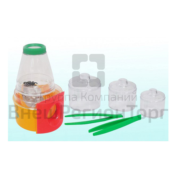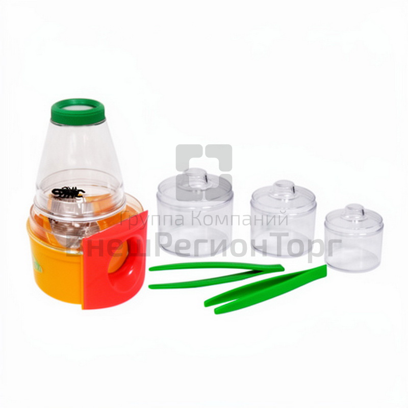 Набор миниатюрной лаборатории включает прочную колбу из пластмассы с плотно закрывающейся крышкой, в которой помещена лупа с 3-кратным увеличением, 3 стаканчика для лабораторных исследований и пинцет.
