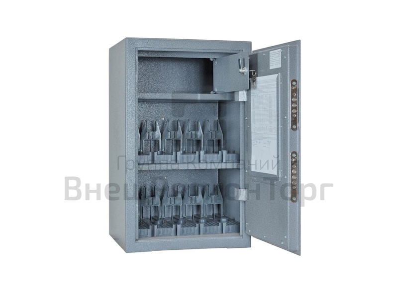 Сейф оружейный односекционный на 10 стволов. Оснащен съемной полкой и отделением под патроны. Комплектуется 10 универсальными подставками под пистолет - ПУ. На внутреннюю сторону двери устанавливаются 2 рамки под опись. Два замка ключевых 8-ми сувальдных.