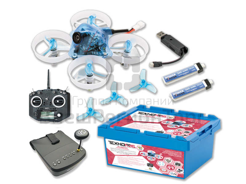 Набор состоит из большого количества безопасных FPV квадрокоптеров, полноценного набора гоночной трассы, автоматической системы подсчета времени, методического пособия по практике управления дронами и массы важных для обучению полётам вещей.