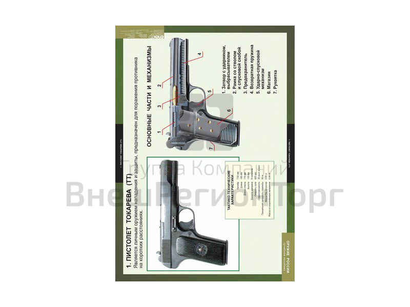 Пистолет Токарева (ТТ). Пистолет Макарова (ПМ). Снайперская винтовка Драгунова (СВД). Автомат Калашникова (АКС-74, АКС-74У). Пулемет Калашникова мадернизированный (ПКМ). Ручной противотанковый гранатомет (РПГ-7). Автоматический гранатомет (АГС-17). Ручные осколочные гранаты.Размер: 68х98 см
