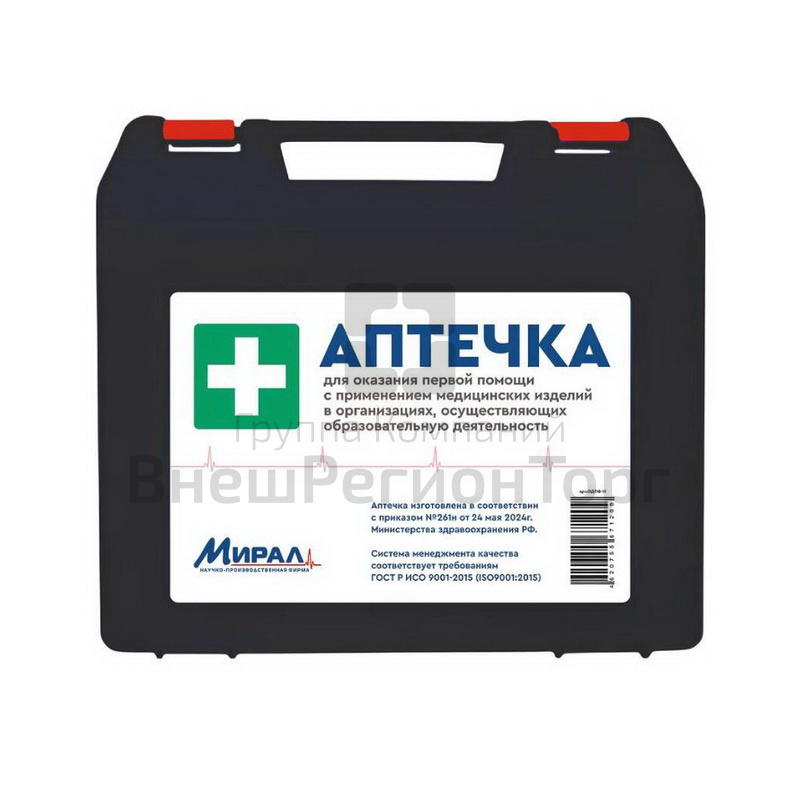 Аптечка для оказания первой помощи с применением медицинских изделий в организациях, осуществляющих образовательную деятельность (Приказ Министерства здравоохранения РФ от 24.05.2024г.№ 261н.), форма выпуска — пластиковый футляр.