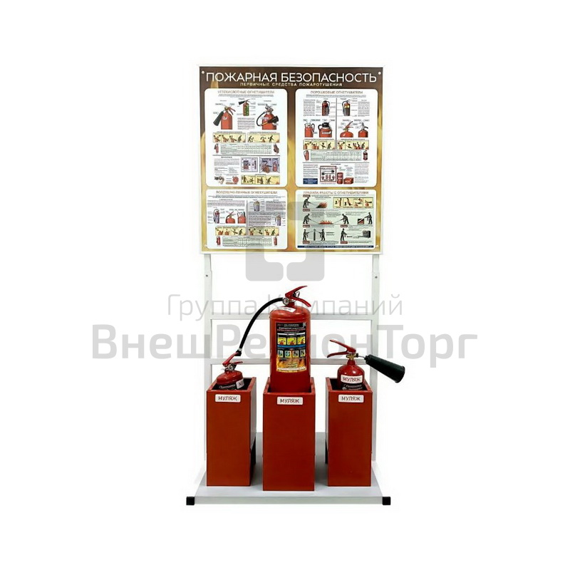 Состав: стационарное металлическое основание, покрытое порошковой износоустойчивой эмалью, информационная панель, макеты огнетушителей: огнетушитель углекислотный типа ОУ-2, огнетушитель пенный типа ОВП-10, огнетушитель порошковый типа ОП-2 с надписью "Муляж", паспорт.