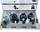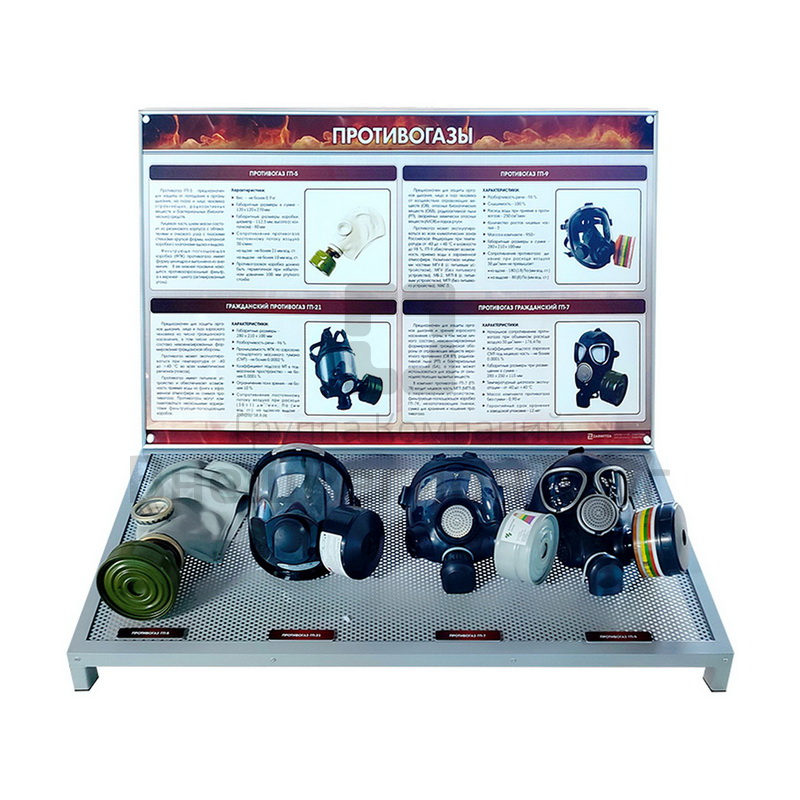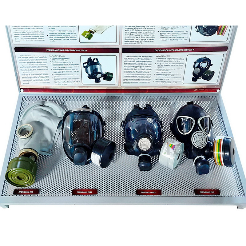 Учебное оборудование представляет собой основные применяемые образцы противогазов, установленные на металлическом основании, и предназначается для изучения индивидуальных средств защиты органов дыхания.