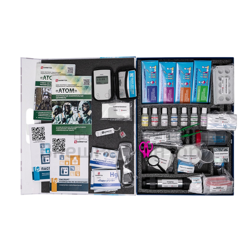 Мини экспресс-лаборатория радиационно-химической разведки «Атом» – это компактный и многофункциональный набор, предназначенный для учебных, исследовательских работ и практических занятий по изучению и выявлению факторов радиационной и химической опасности в рамках курса «Основы безопасности и защиты Родины».