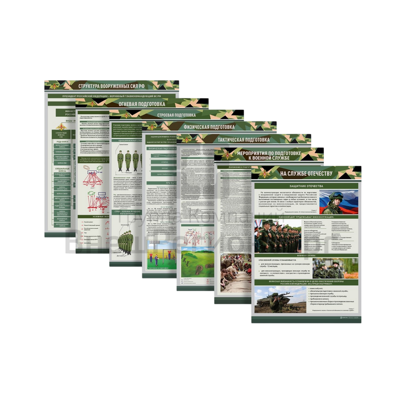 - Габариты, мм: стенд "Структура Вооруженных сил Российской Федерации" - 1200х1400; стенд "Строевая подготовка" - 1200х1400; стенд "Физическая подготовка" - 1200х1400; стенд "Тактическая подготовка" - 1200х1400; стенд "Огневая подготовка" - 1200х1400; стенд "На службе Отечеству" - 700х1000; стенд "Мероприятия обязательной подготовки граждан к военной службе" - 700х1000.