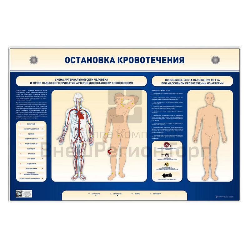 Электрифицированный стенд-тренажер представляет собой полноцветную информационную панель с комбинированной световой индикацией. На стенде-тренажере изображена артериальная сеть человека с обозначением мест возможного кровотечения вследствие различных травм, точек пережатия артерий для быстрой остановки кровотечения и областей наложения жгутов. В конструкцию учебного оборудования интегрированы высокочувствительные сенсоры для управления стендом при помощи интерактивного воздействия приемо-передающих устройств во время обучающего процесса.