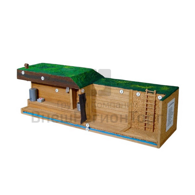 Элементы макета: обшитая/необшитая щель-траншея, вход в перекрытую щель, лестница для спуска, 3-х слойное щитовое перекрытие (съемное), герметичный занавес или дверь, водосточная канавка с накопителем, водоотводящие канавки, место отдыха укрываемых, проем (ниша) для хранения продуктов и воды, вентиляционный короб, фонарь освещения, аптечка. Цифровая маркировка элементов. Табличка обозначений.