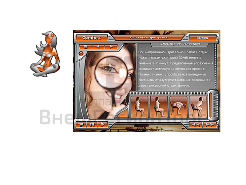 Работа с пакетом "Комфорт" доступна широкому кругу пользователей компьютеров, включая тех, кто обладает невысокой "компьютерной" квалификацией и особенно полезна работникам умственного труда. Содержит более 40 методик и упражнений.