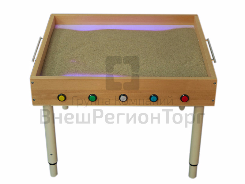 Благодаря регулируемым по высоте ножкам, стол могут с комфортом использовать дети разных возрастов. Переключение подсветки стола осуществляется при помощи кнопок, вмонтированных в корпус стола. В комплект входит 12,5 кг песка.