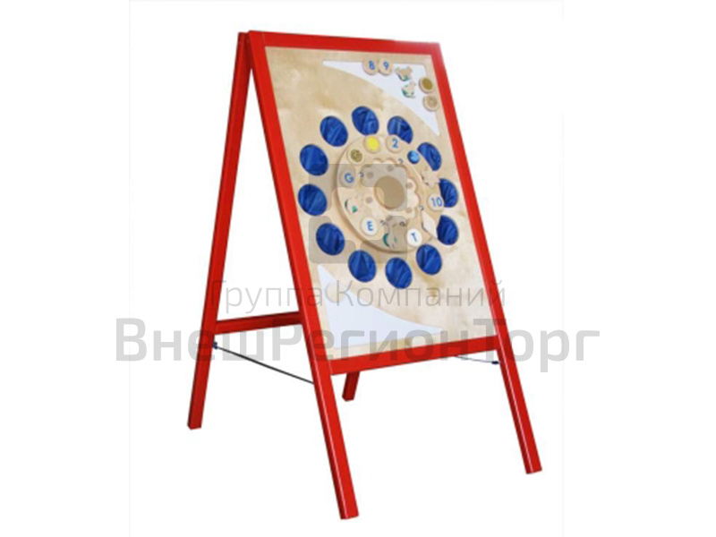 Игра представляет собой деревянный напольный стенд с четырьмя опорами (ножками) и игровым полем. На игровом поле размещены: «рулетка» - крутящийся диск с перемещающимся металлическим «указателем» - шариком и вокруг по диску 12 кружочков - магнитов для прикрепления пособий на магнитах; вокруг «рулетки» - диска выпилено 12 круглых «окошек», в которых спрятаны 12 синих «волшебных» мешочков – «тайничков»; сверху справа и снизу слева находятся две треугольные магнитные доски для размещения - демонстрации снятых с диска или дополнительных дидактических материалов.