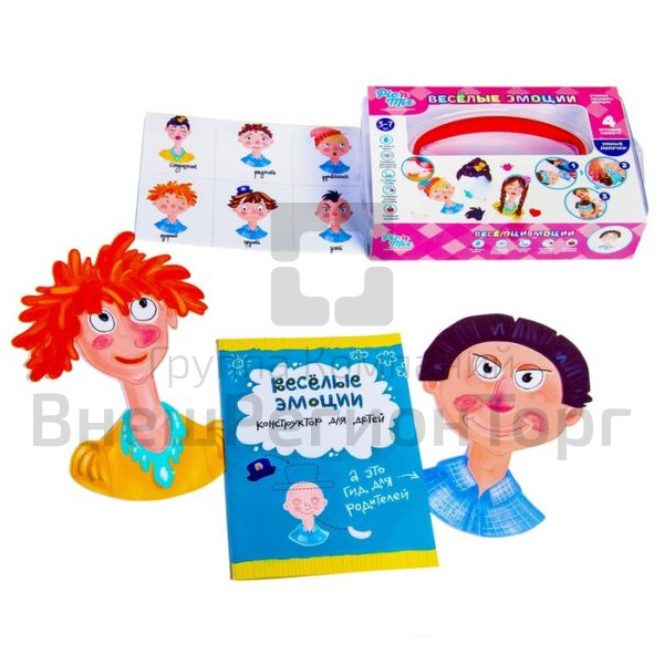 В КОМПЛЕКТЕ: 2 лица; 12 карточек с картинками; 12 причесок; 48 черт мимики; 53 липучки на клеевой основе; инструкция.