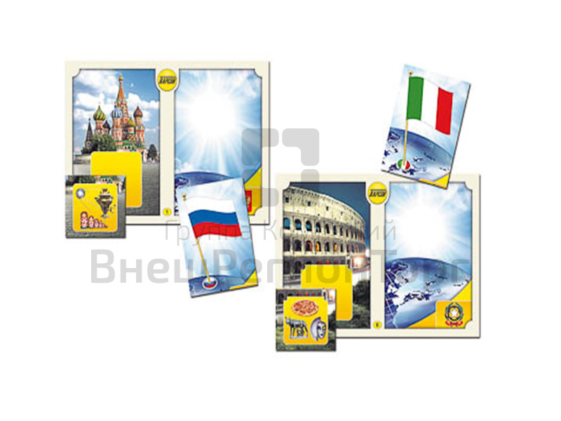 На карточках для правой части игрового поля изображены флаги и часть карты мира, они служат продолжением изображений на игровых полях и содержат общие с ним детали фона. На карточках для левой части игрового поля дана врезка, на которой представлены предметы, являющиеся как бы «визитной карточкой» данной страны. Контуры врезки (вырезанные уголки) служат подсказкой.