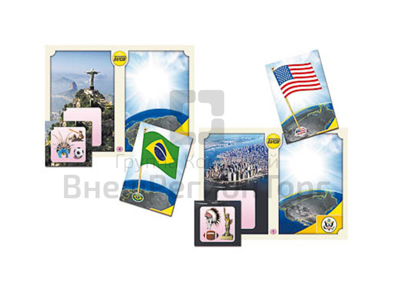 На карточках для правой части игрового поля изображены флаги и часть карты мира, они служат продолжением изображений на игровых полях и содержат общие с ним детали фона. На карточках для левой части игрового поля дана врезка, на которой представлены предметы, являющиеся как бы «визитной карточкой» данной страны. Контуры врезки (вырезанные уголки) служат подсказкой.