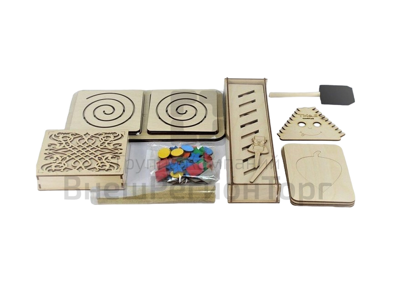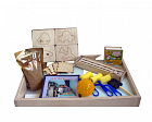 Универсальный набор создан для развития речи, обучению счёту, письму. Комплект собран из материалов преимущественно из дерева.