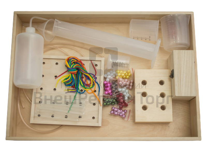 В составе модуля: коробочка с крышкой для бусинок, пластиковые бусины - 10 цветов по 13 шт., стеклянные пробирки - 10 шт., подставка для пробирок, емкость 250 мл - 2 шт., емкость 100 мл - 2 шт., емкость 50 мл - 2 шт., воронка 76 мм - 2 шт., промывалка 1 л - 2 шт., кружка со шкалой 0,5 л - 2 шт., прозрачный шланг длиной 2 м, стакан лабораторный.