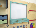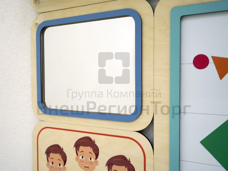 - Модуль «Эмоции» со стрелкой и акриловое безопасное зеркало. С его помощью дети учатся распознавать свои и чужие эмоции, выставляют эмоцию на круге и показывают её в зеркале, угадывают эмоции друг друга. Служит для развития эмоционального интеллекта, рекомендован детям с РАС.