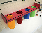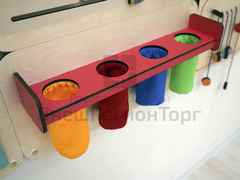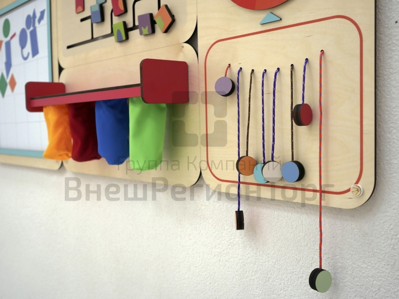 Мешочки для работы с тактильным восприятием. Внутрь кладутся магнитные фигуры из ящичков, и дети на ощупь должны угадать предмет, последовательность предметов. Мешочки разной плотности, что дает большую вариацию упражнений и возможность деления на уровни сложности. - Цветные бусины на шнурке служат для изучения цветов радуги. Когда ребёнок тянет одну вниз, другая бусина поднимается вверх. Это способствует тактильной стимуляции и развитию координации движений.