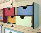 - Доска в клетку и магниты, хранящиеся в ящичках. Это аналог ларчика Воскобовича, только поверхность не ковровая, а магнитно-маркерная. Также фигуры в магнитах могут использоваться для развития ребёнка по системе Фребеля. Дети из фигур собирают картины, которые психолог анализирует.