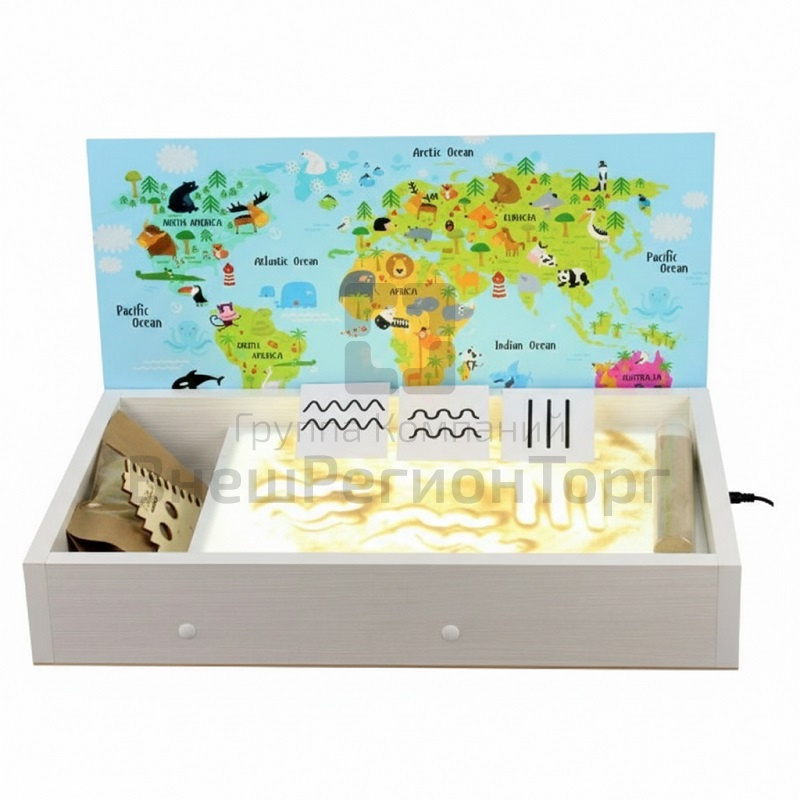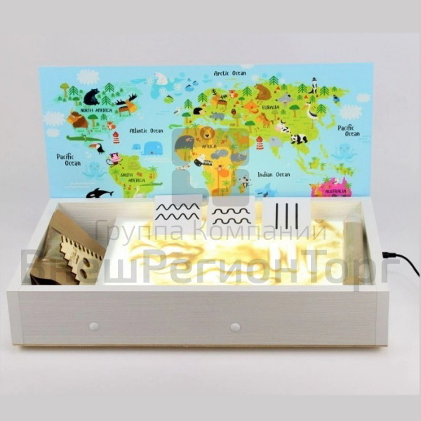 В комплекте: световой-планшет, песок, подсветка, яркий корпус, отсек для инструментов и песка.