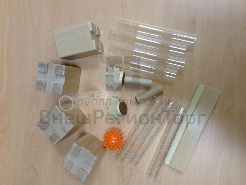 - 7 прозрачных пластиковых валиков с разными отверстиями (20х3х3 см). При прокатывании на песке остаются разные узоры - снеговики, рыбки, кораблики, цветы, бабочки, ёлочки, орнамент;