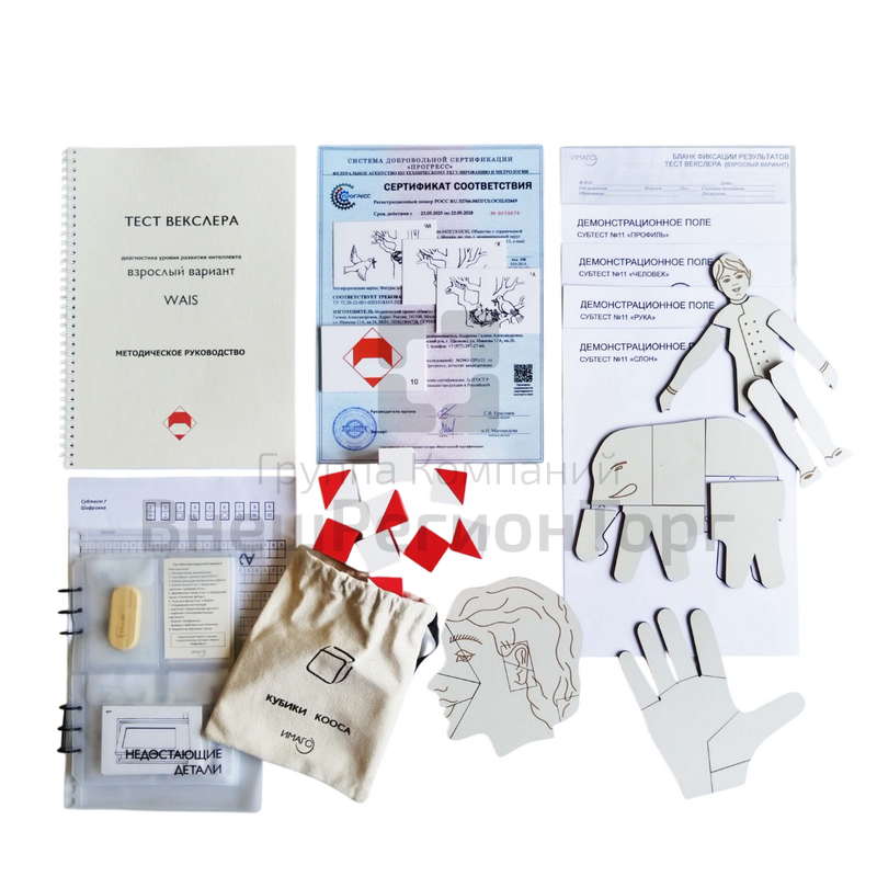 В предлагаемом наборе представлен выверенный и качественный стимульный материал. Детали пазлов для субтеста "Складывание фигур" выполнены из дерева толщиной 3 мм, на ламинированной белой стороне выгравирован рисунок. Детали хранятся в четырех пластиковых карманах на молнии, скрепленных в блокнот на металлических кольцах. Кубики деревянные, размер 3х3х3 см., краска не имеет запаха. Карточки упакованы в пластиковые кармашки, так что они не перепутаются в процессе тестирования.