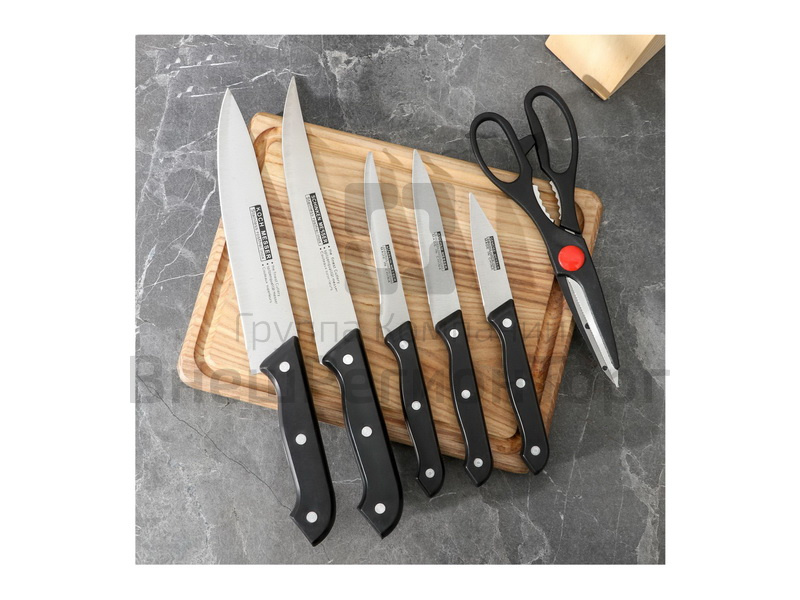 Подробное описание Набор кухонный, 6 предметов: 5 ножей и ножницы, на подставке
