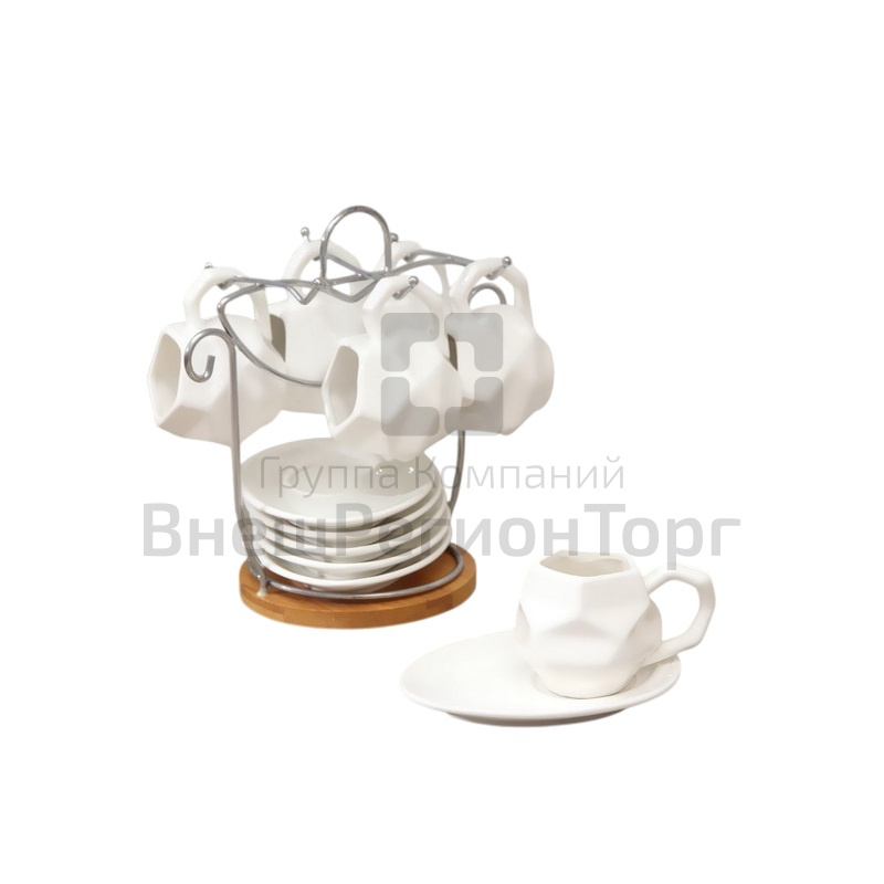 В наборе 12 предметов: 6 чашек 100 мл, 6 блюдец 11,7 см, на деревянной подставке.