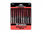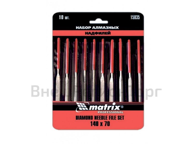 В набор входят 10 надфилей: плоский, круглый, полукруглый, квадратный, трехгранный, трехгранный односторонний, ромбический, овальный, овальный двухсторонний, заостренный.