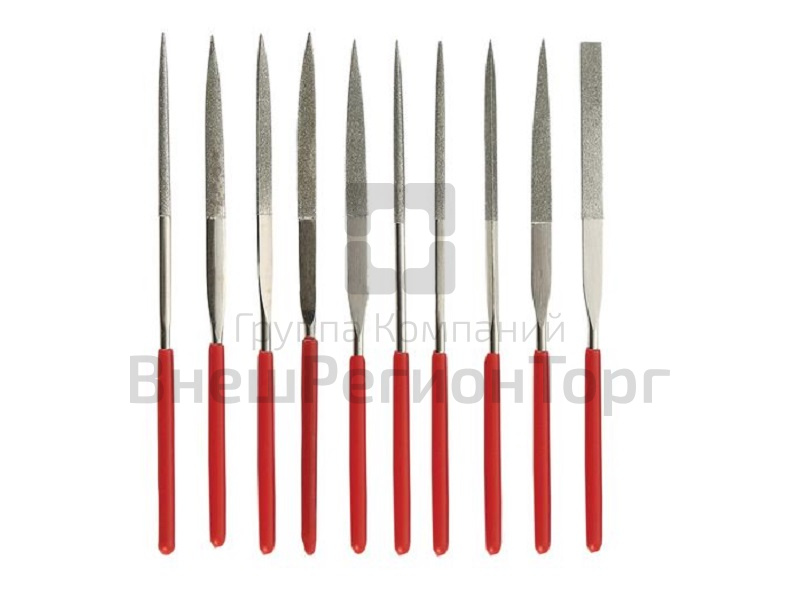 В набор входят 10 надфилей: плоский, круглый, полукруглый, квадратный, трехгранный, трехгранный односторонний, ромбический, овальный, овальный двухсторонний, заостренный.