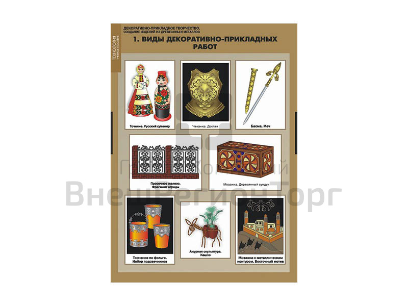 Виды декоративно-прикладных работ. Мозаика. Инструменты и приспособления. Виды мозаики на изделиях из древесины. Приемы выполнения мозаичных работ. Стадии выполнения мозаичных работ. Точение декоративных изделий из древесины. Правила безопасного труда при художественной обработке древесины. Тиснение по фольге. Ажурная скульптура из металла. Технология изделий из проволоки. Мозаика с металлическим контуром. Басма. Пропильный металл. Чеканка. Инструменты и приспособления. Плоскорельефная чеканка. Правила безопасного труда при декоративной обработке металла.