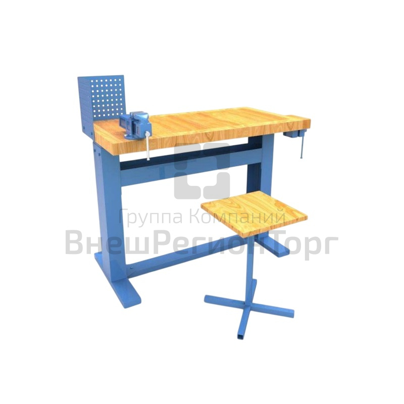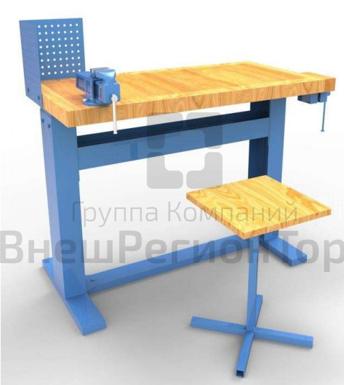 Верстак на прочном металлическом каркасе, с регулируемой высотой столешницы из массива дерева хвойных пород, ящик-ниша для инструмента поможет поддержать порядок на рабочем месте.